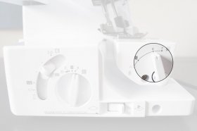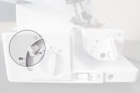 First, let’s learn a bit about the anatomy of the serger. Below is an image of what the three dials on the side of the Brother 1034D are used for. For most fabrics, I keep these dials at the default settings as noted by the numbers within grey rectangles.